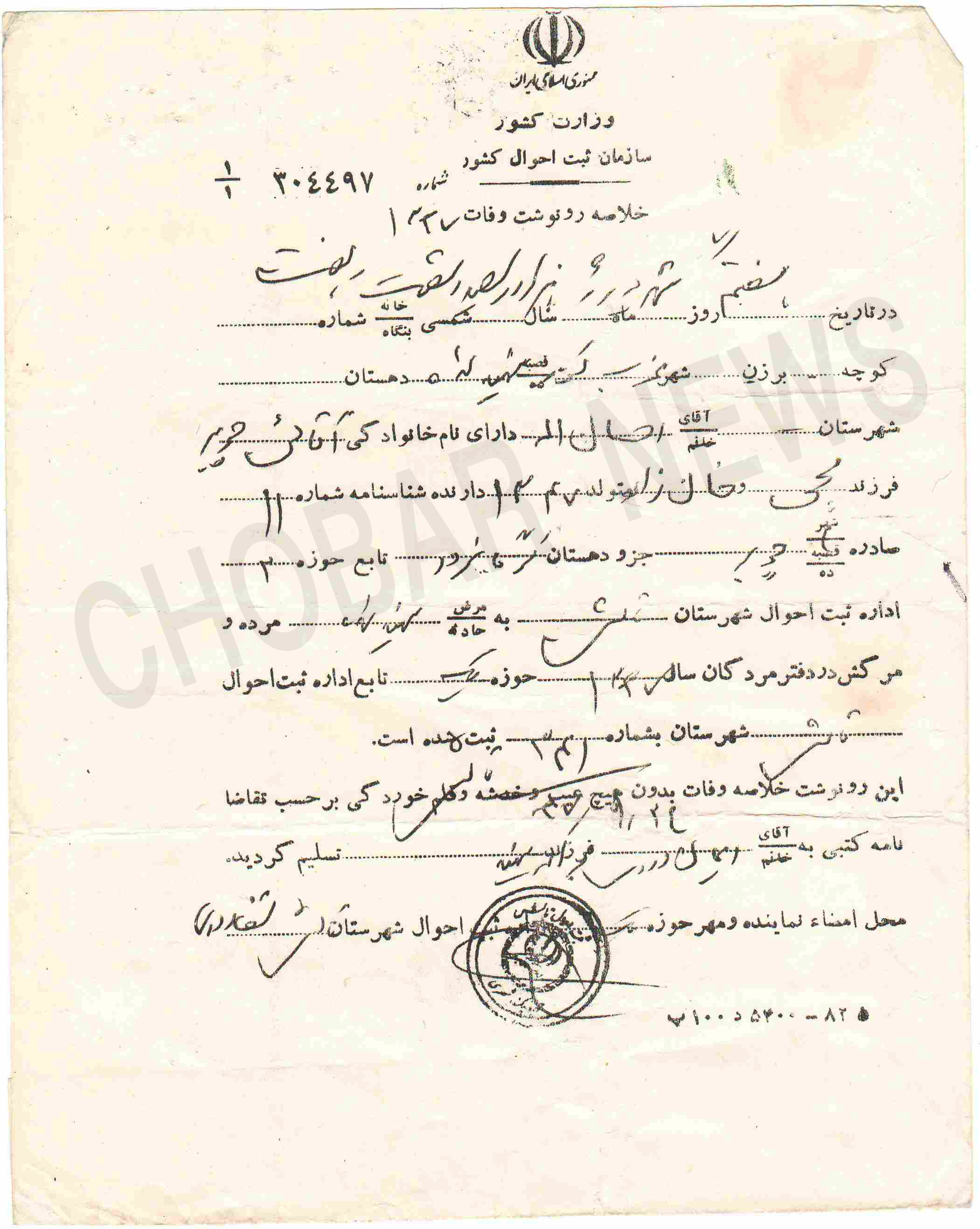 رونوشت وفات شهید آقایی